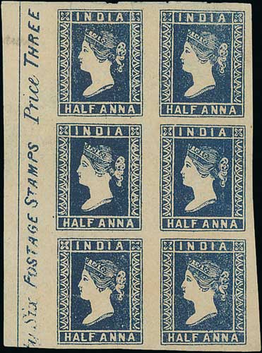 1264 image1854 ½a Indigo die I, left marginal block of six (2x3) from the rare A4 stone (positions 49/66) with part inscription, large margins, faint toning, otherwise fine unused. A rare multiple with distinctive inscription type. S.G. 5, £5,400+. Photo included on Front Cover. (Image1)