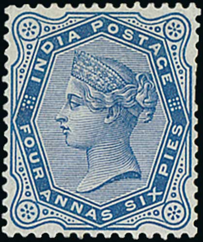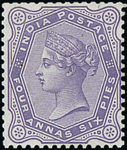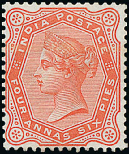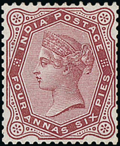 1265 1879 McCorquodale & Co imperforate dummy stamps inscribed "West India / Four Annas", based upon the 1866 De la Rue 4a stamp, block of fifty (columns 1-4) in rose on unwatermarked wove paper, large 143mm margin at left, 27mm upper and lower margins, vertical marginal fold and marginal tears and faults, especially in the lower margins with tears affecting two stamps, 242x280mm. These dummy stamps were used in McCorquodale s tender for the 1879 G.B 1d stamp. (50).