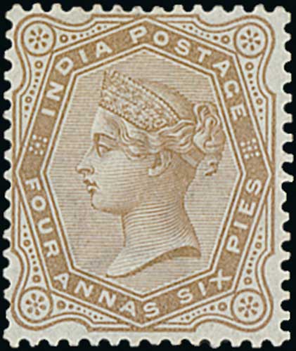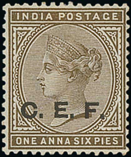 1270 imageChina Expeditionary Force. 1900 Unissued 1a6p sepia with C.E.F overprint, mint with large part original gum, reverse with a small piece of paper adhering, natural gum creases, otherwise very fine. S.G. C10c, £500. Photo on Page 198. (Image1)