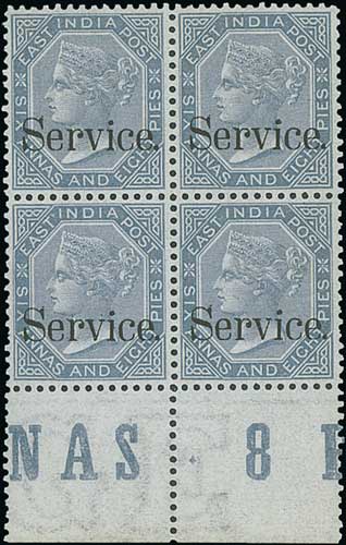 1267 imageOfficials. 1868 6a8p Slate with Service overprint type O7, prepared for use but never issued, mint marginal block of four, "NAS 8P" partial inscription in margin, lightly mounted on the upper pair with the lower pair unmounted, a couple of short perfs, otherwise superb. S.G. O30b, £3,000+. Photo on Page 130. (Image1)