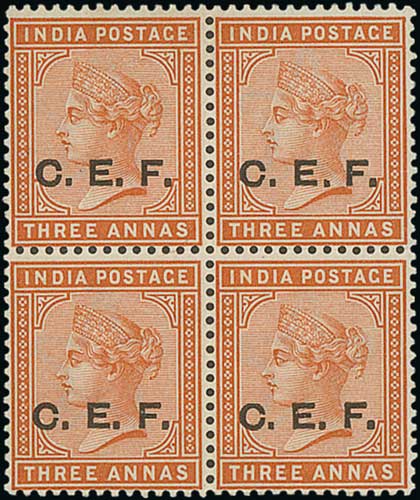 1269 imageChina Expeditionary Force. 1900 3a Brown-orange block of four mint, variety C.E.F overprint double, one albino, lightly mounted on the upper pair with the lower pair unmounted. A fine and scarce block, the albino impression 1mm below and to the right of the inked overprint and very clear on the reverse. Ex Wilson Wong. S.G. C6b, £600. Photo on Page 188. (Image1)