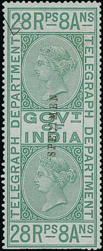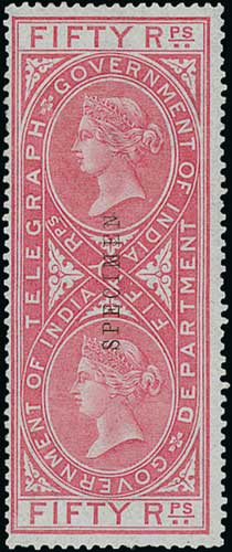 1271 imageTelegraph Stamps. 1869-70 2r-50r Part set of ten (no 1a, 10r) with seriffed "SPECIMEN" overprint type 10 (Samuel D1a) reading upwards, the 1r die II, 2r.8a, 25r and 50r die I, also additional die I 50r with overprint reading downwards. Faults to the 14r.4a, 28r.8a and additional 50r, 25r on piece, otherwise fine mint, very scarce. (11). Photo on Page 188. (Image1) (Image2) (Image3) (Image4) (All Images)
