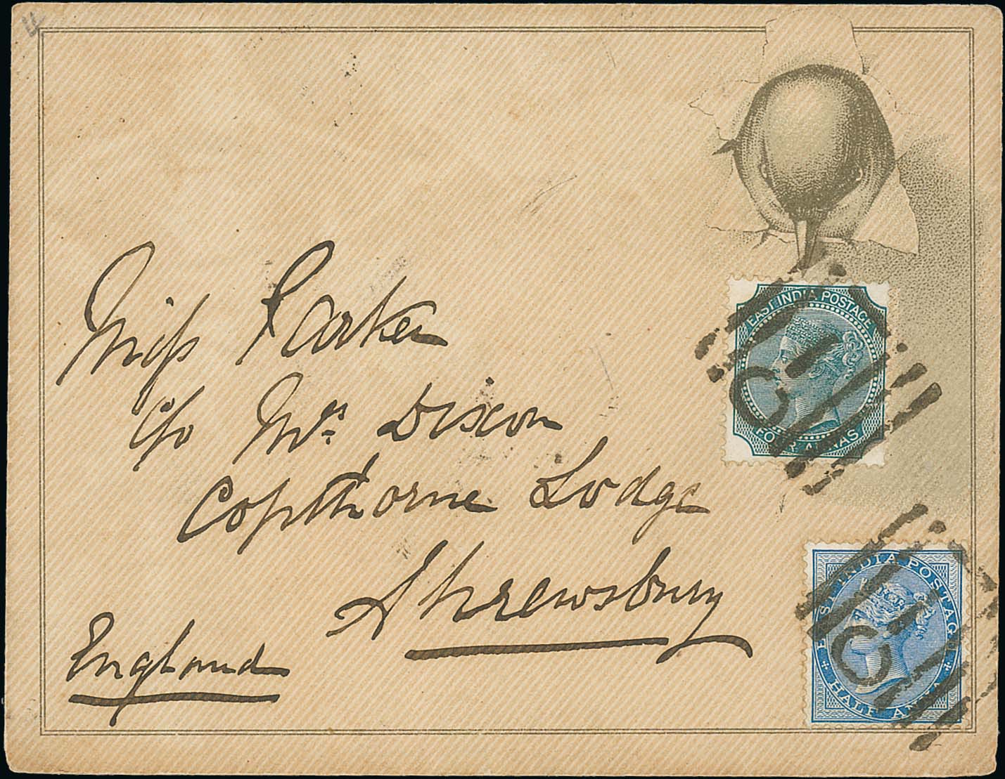 1321 1867-68 Covers from Calcutta franked 8a to Aden or 14a8p to France, both endorsed via Bombay and express with an additional 4a paid for the express fee, both backstamped red octagonal "EXPRESS LETTER / G.P.O / CALCUTTA" datestamp, the first with incorrect date OC 9 instead of NO 9, the cover to Aden with minor staining, otherwise fine. (2).