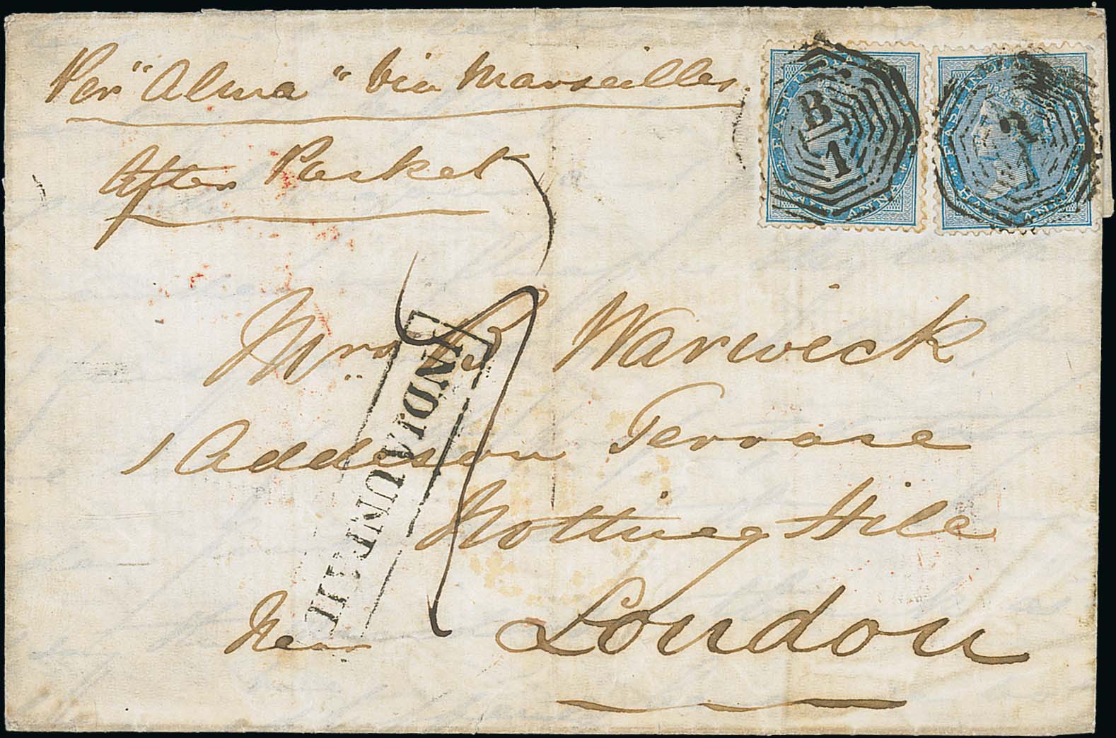 1317 1859-64 Covers from Calcutta to G.B endorsed "via Marseilles p. After Packet", the first franked 7a, the second 7a8p, both including the 1a after packet fee to Kedgeree, minor faults. (2).