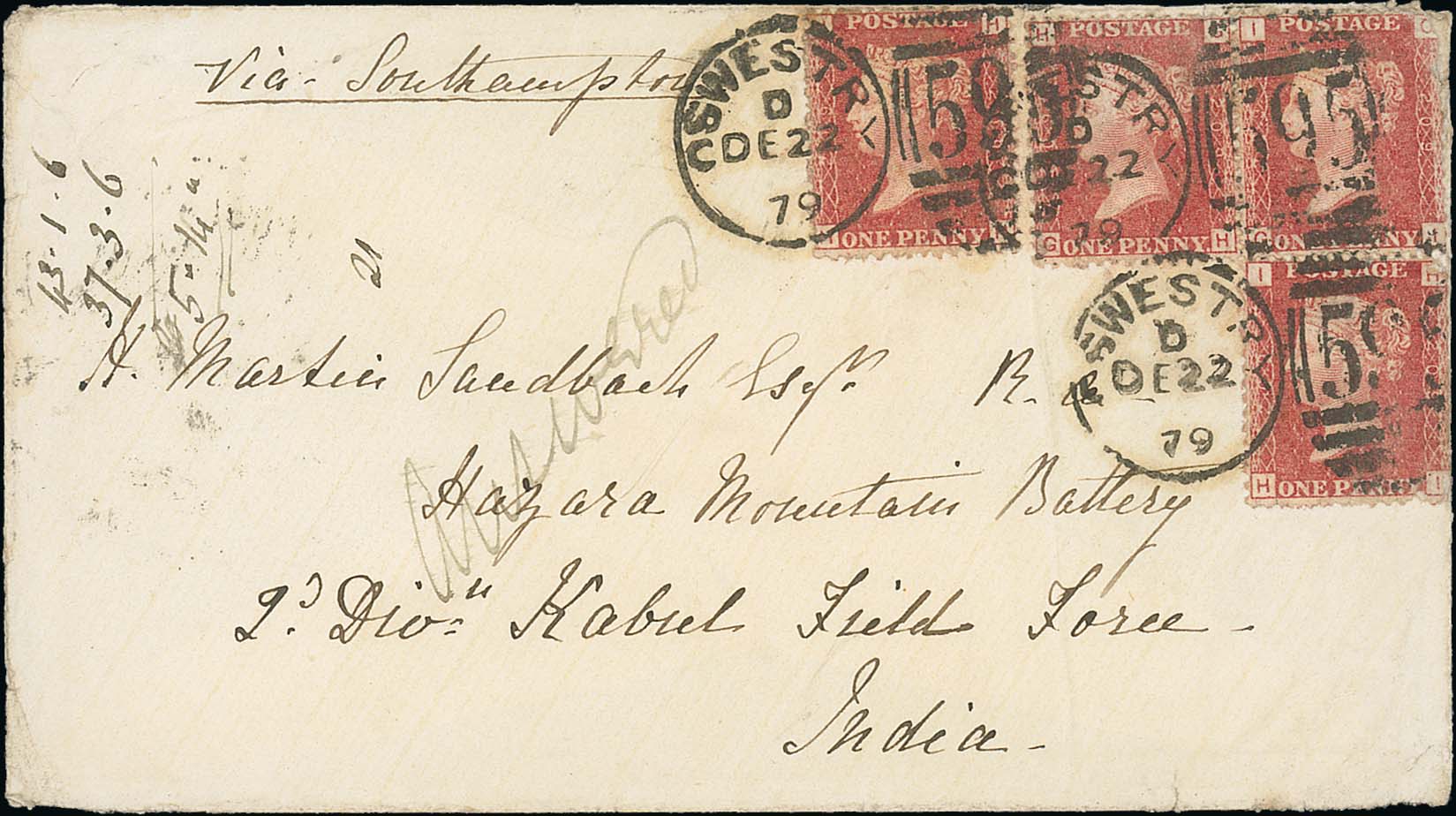 1379 imageSecond Afghan War. 1879 (Dec 22) Cover from Oswestry to "H.M Sandbach R.A, Hazara Mountain Battery, 2nd Div. Kabul Field Force, India", via Southampton, franked by four 1d reds, Sea Post Office backstamp. Photo on Page 164. (Image1)