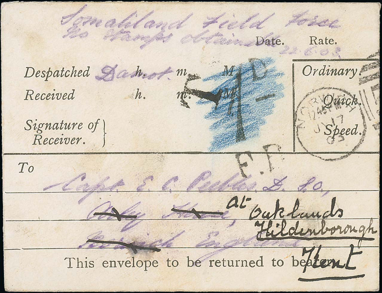 1389 image1903 (June 22) Cover intended for internal military use, posted unpaid to England endorsed "Somaliland Field Force, no stamps obtainable, 22.6.03, Damot", backstamped "F.P.O No. 44", "BASE OFFICE / BERBERA" (July 3), Aden and Tonbridge datestamps, the front handstamped "T", a London Foreign Branch 1d charge mark crossed out when the charge was paid upon redirection, a Norwich duplex alongside, fine and unusual. Photo on Page 170. (Image1)