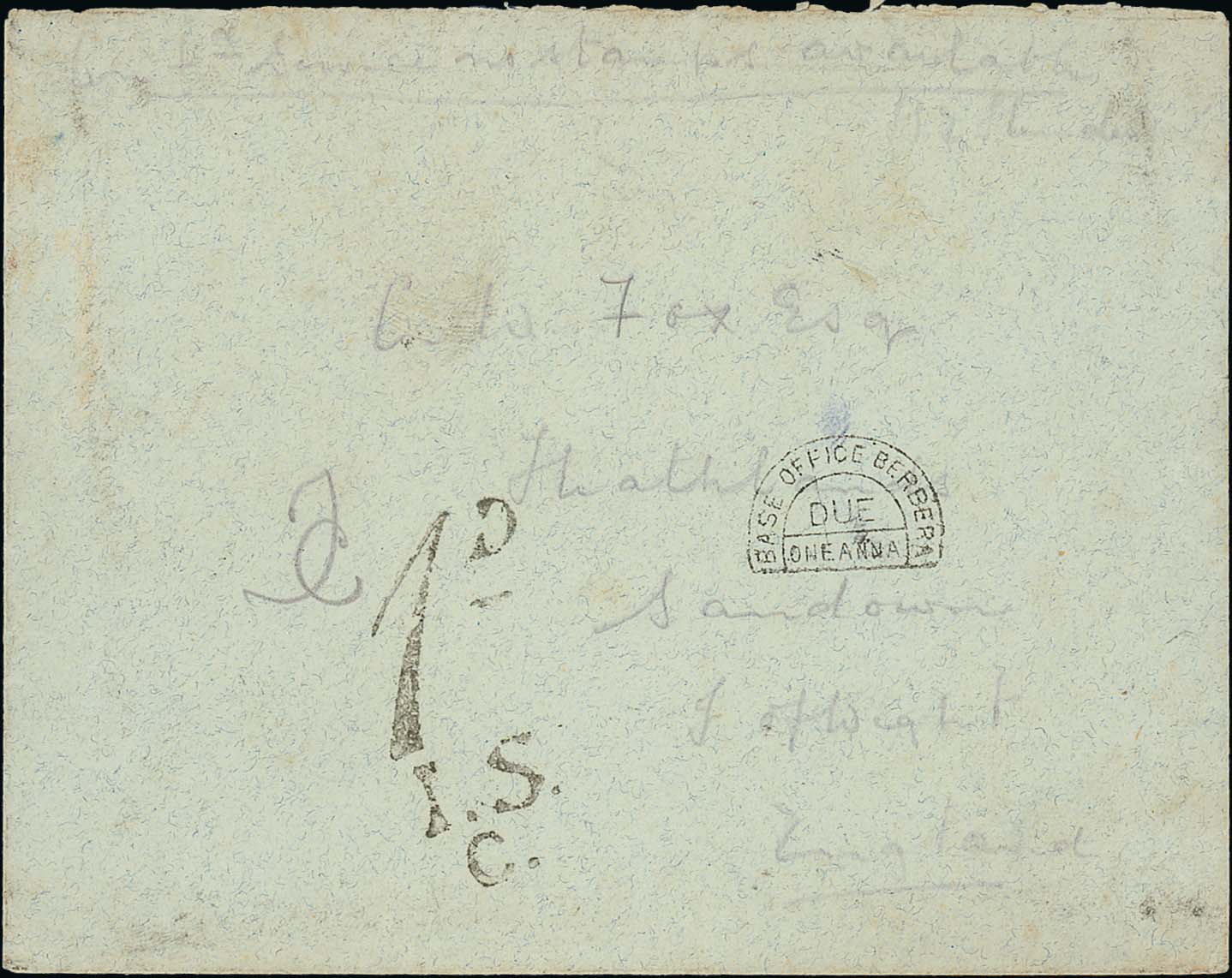 1392 image1904 (Jan 4) Stampless cover to the Isle of Wight, endorsed "On Active Service, no stamps available, H.E Henderson", backstamped "F.P.O No. 44", Aden and Sandown datestamps, the front with the scarce semi-circular "BASE OFFICE BERBERA / DUE / ONE ANNA" (intended for use on mail to Indian Post Offices, incorrectly used here on a cover to G.B), a 1d charge mark applied in the London Inland Section. A fine campaign cover. Photo on Page 170. (Image1)