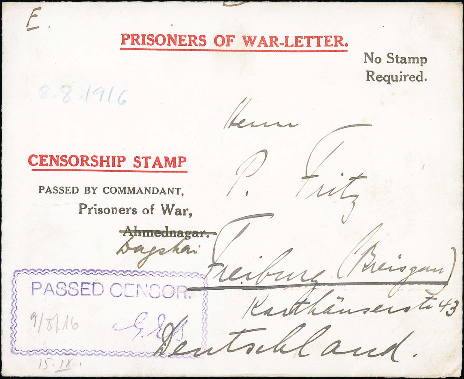 1394 Ahmednagar. 1915-19 Stampless Prisoner of War envelopes (51) from Camps "A" or "B" or the P.O.W Hospital, including covers from A. Fritz to relatives in Germany (18) and covers to Cambridge & Co. Ltd (12) or Mrs A Will (6) in Bombay, various censors and envelope types. Also two covers to the camp, a picture postcard of the P.O.W camp, and the 1918 63 page "Reports on British Prison-Camps in India and Burma, visited by the International Red Cross Committee in Feb.-April 1917" published in New York. (55).