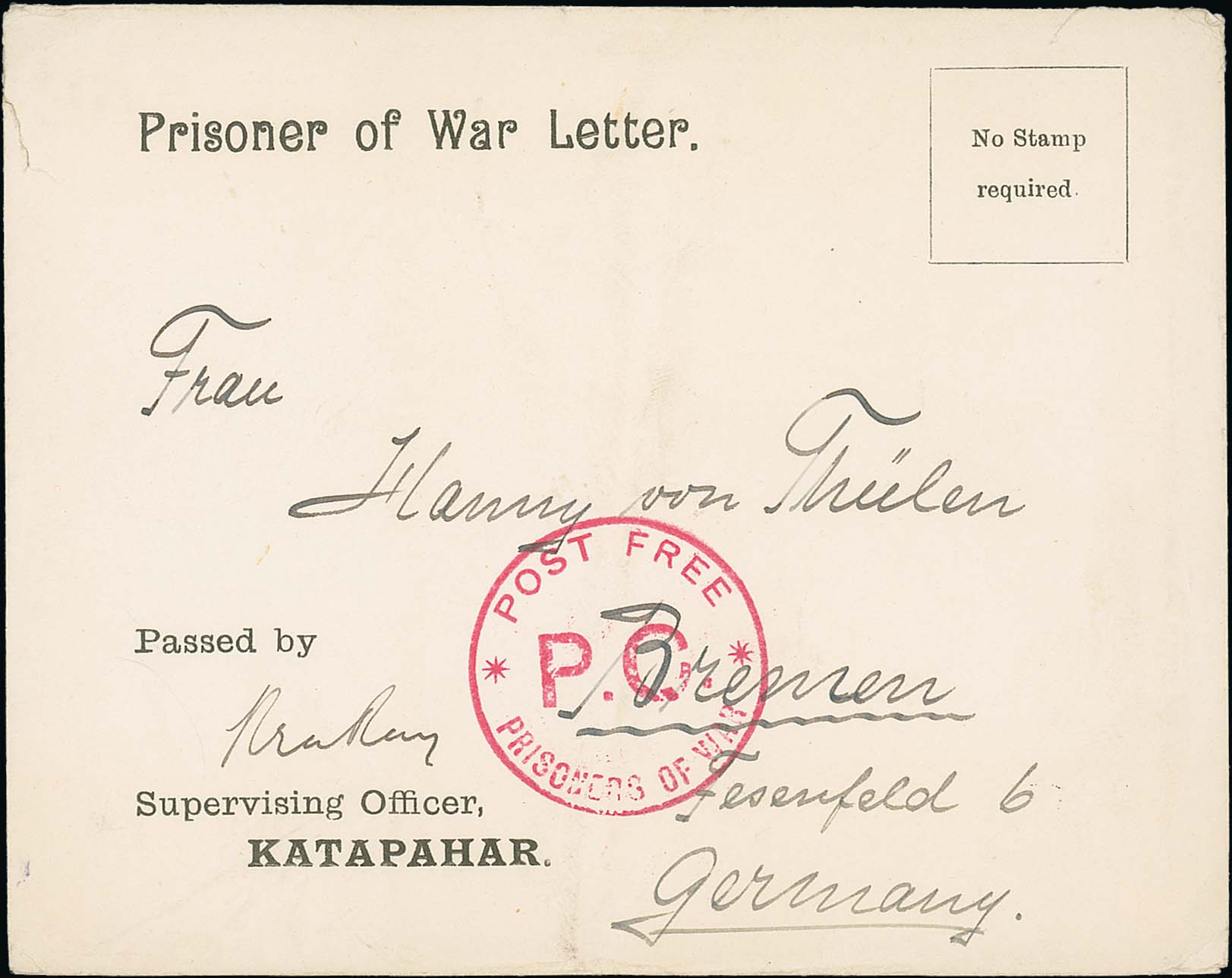 1399 imageKatapahar. c.1915 Stampless covers to Germany with circular "POST FREE / P.C / PRISONERS OF WAR", one a printed envelope with "Prisoner of War Letter" heading and "Passed by / Supervising Officer / KATAPAHAR" signed R.E.A Ray, the other with similar wording in manuscript. Very little mail recorded from this camp, which held just 36 people in a census of March 1916. (2). Photo on Page 170. (Image1)