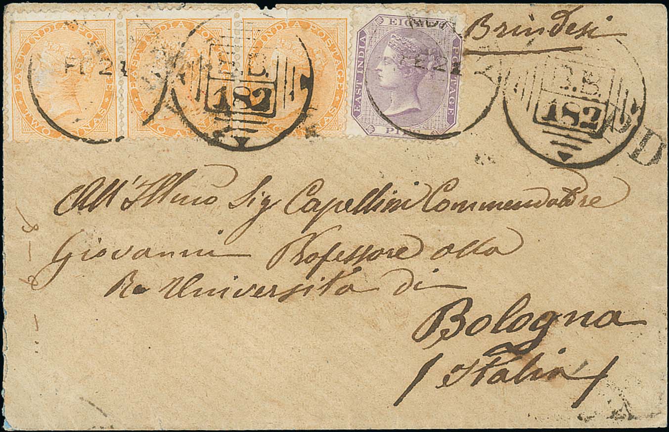 1455 image1872-74 Covers with type 9 duplex cancels, 1872 cover to Jersey franked 2a + 4a cancelled by "THYETMYO / B / 159" duplex (Proud KD4); and 1874 cover to Italy franked 8p + 2a strip of three cancelled by scarce "MANDALAY / B.B / 180" duplexs (Proud KD2), octagonal Rangoon backstamp. (2). Photo on Page 178. (Image1)