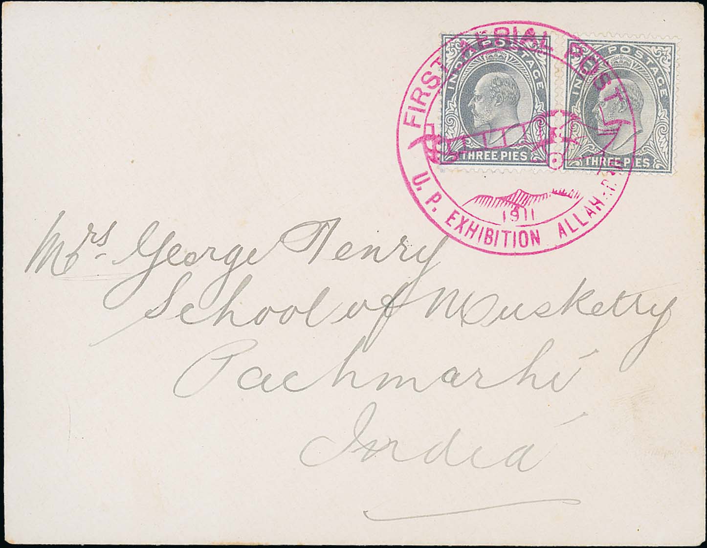 1457 image1911 (Feb 18) Allahabad First Aerial Post, cover to Pachmarhi bearing two KEVII 3p stamps with the special pictorial cancel in magenta, Allahabad and Pachmarhi backstamps, very fine. Photo on Page 178. (Image1)