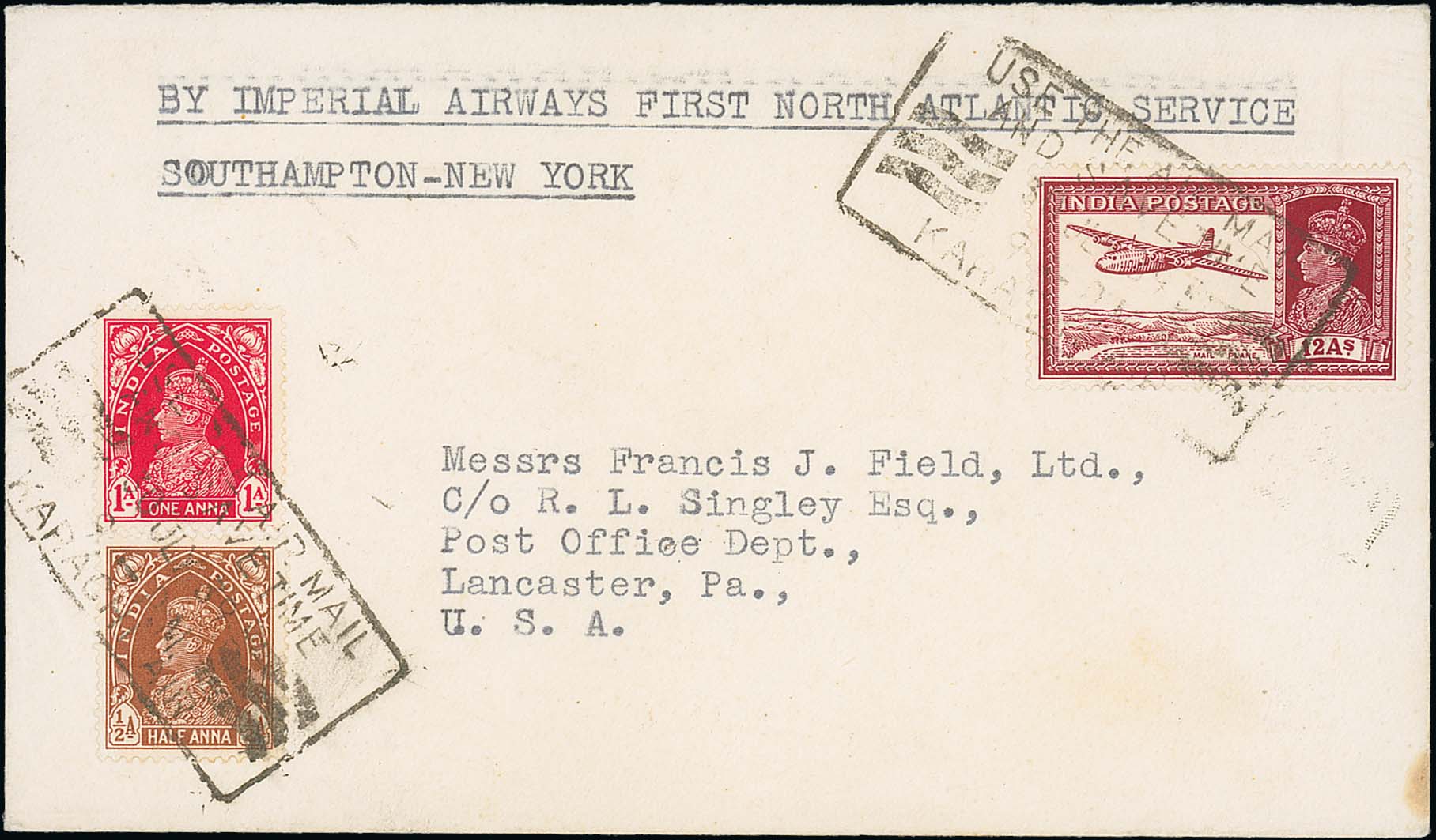 1464 image1939 (July 30) Cover from Karachi to USA franked 13½a, carried on the first Imperial Airways flight from Southampton to New York, arrival backstamp (Aug. 6), fine and scarce, just five covers carried from India. Photo on Page 178. (Image1)