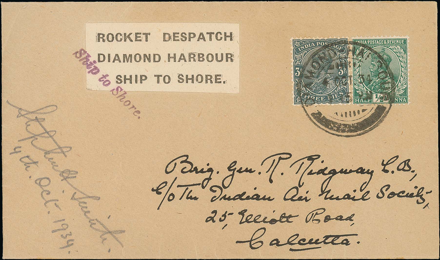 1468 image1934 (Oct 4) Diamond Harbour ship to shore rocket flight no. 10, cover with vignette tied by "Ship to Shore" cachet, KGV 3p + ½a tied by Diamond Harbour c.d.s, signed by Stephen Smith, also an unused vignette. Fine, 75 covers flown. (2). Photo on Page 178. (Image1)