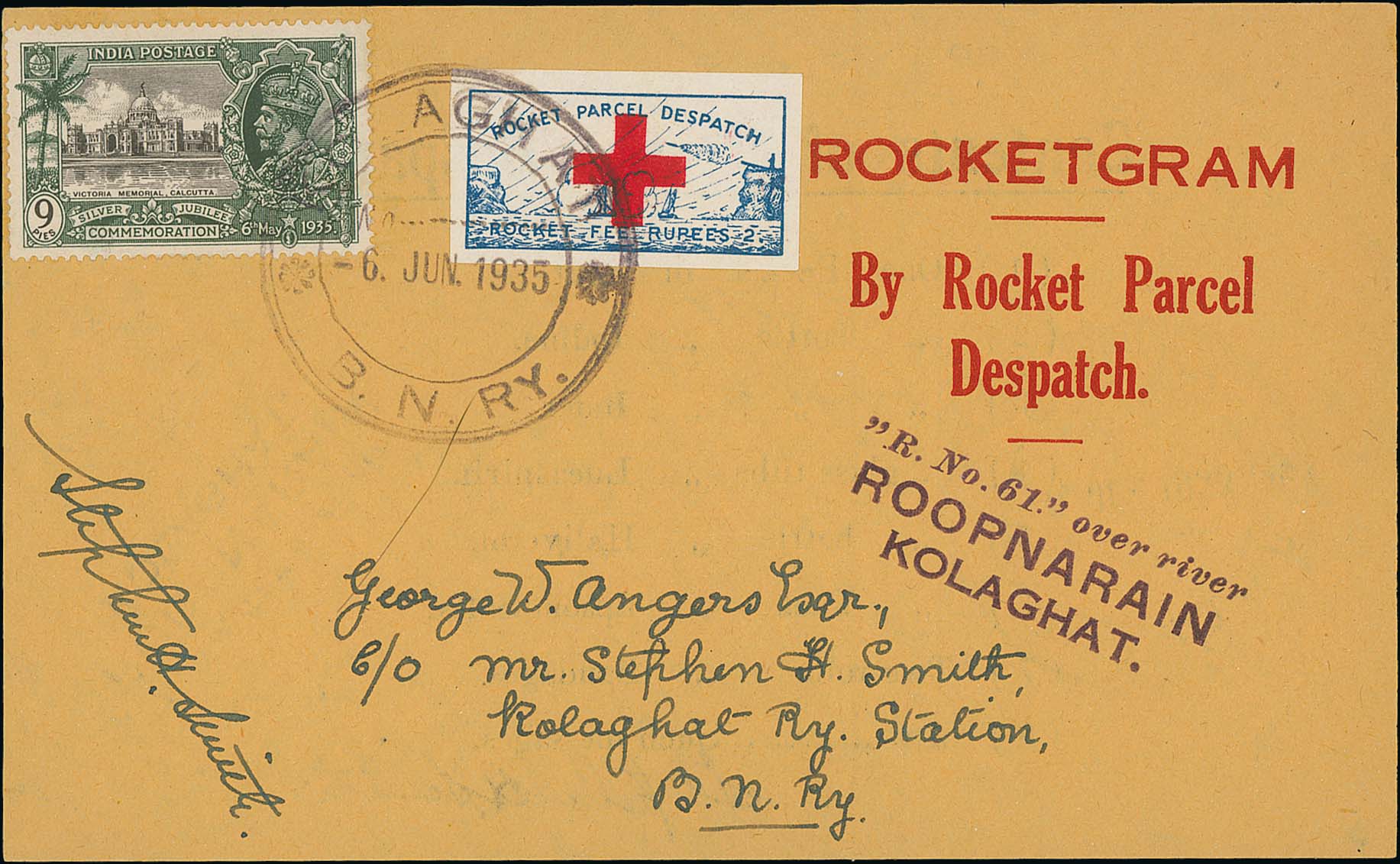 1478 image1935 (June 6) Red Cross rocket, printed Rocketgram form flown on rocket 61 fired over the Roopnarain River, bearing Silver Jubilee 9p and Rocket Parcel Despatch 2 rupee vignette with Red Cross overprint tied by circular "KOLAGHAT / S.N. RY" dated cachet, very fine, 110 forms flown. Photo on Page 178. (Image1)