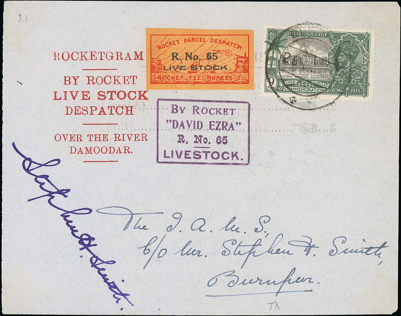 1479 image1935 (June 29) Livestock Despatch rocket, printed Rocketgram form from rocket 65 "David Ezra" fired over the river Damoodar carrying a cock and hen, bearing Rocket Parcel Despatch 2 rupee vignette with "R.No.65 / LIVESTOCK" overprint and a Silver Jubilee 9p cancelled at Burnpur, boxed "BY ROCKET / "DAVID EZRA" / R.No 65 / LIVESTOCK", very fine, 189 forms flown. Photo on Page 178. (Image1)