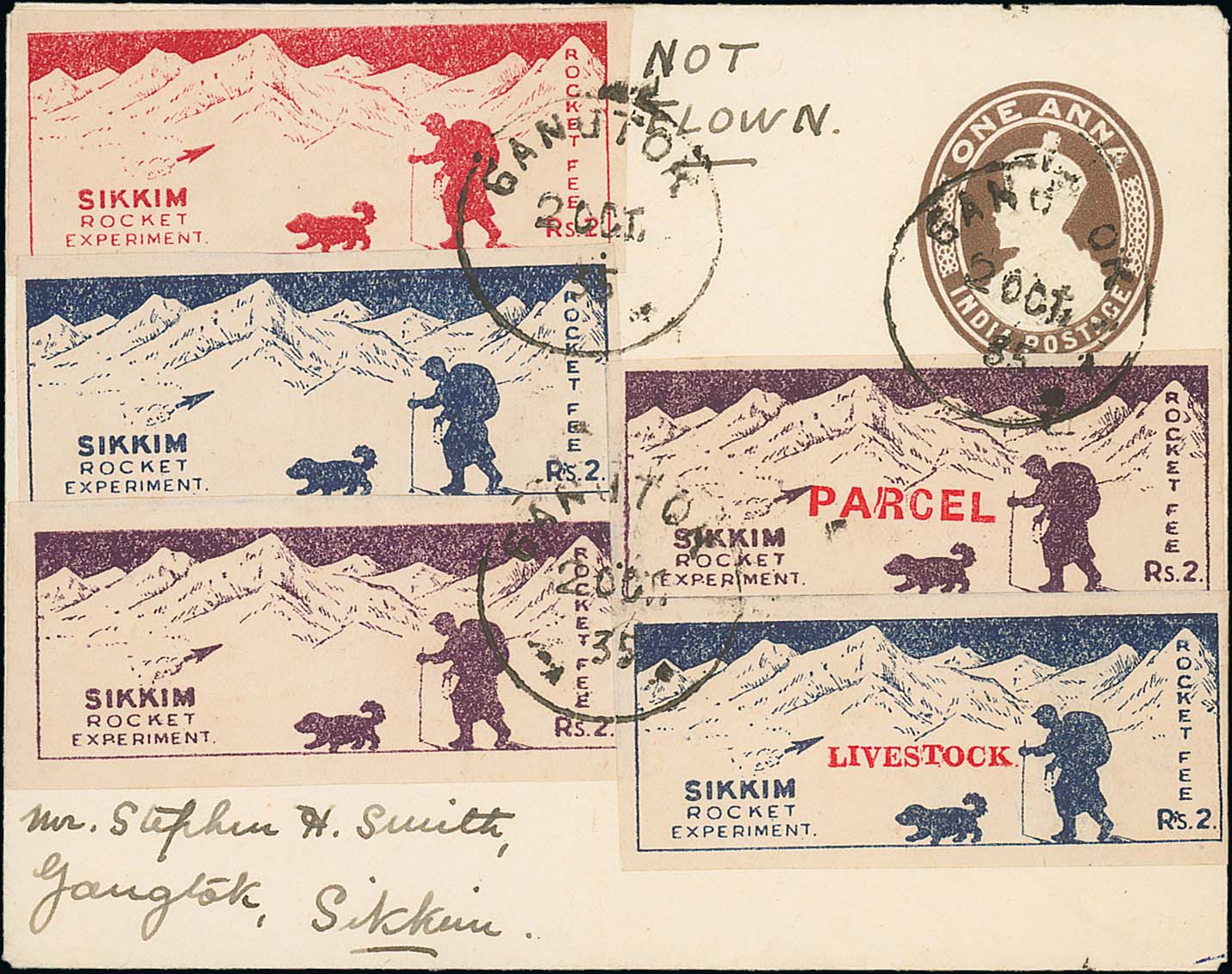 1484 image1935 (Oct 2) 1a Envelope bearing the five different second Sikkim Durbar flight vignettes all cancelled by Gangtok single ring datestamps addressed locally to Stephen Smith, double ring arrival backstamps, endorsed "Not Flown", a very rare cover. Photo on Page 178. (Image1)