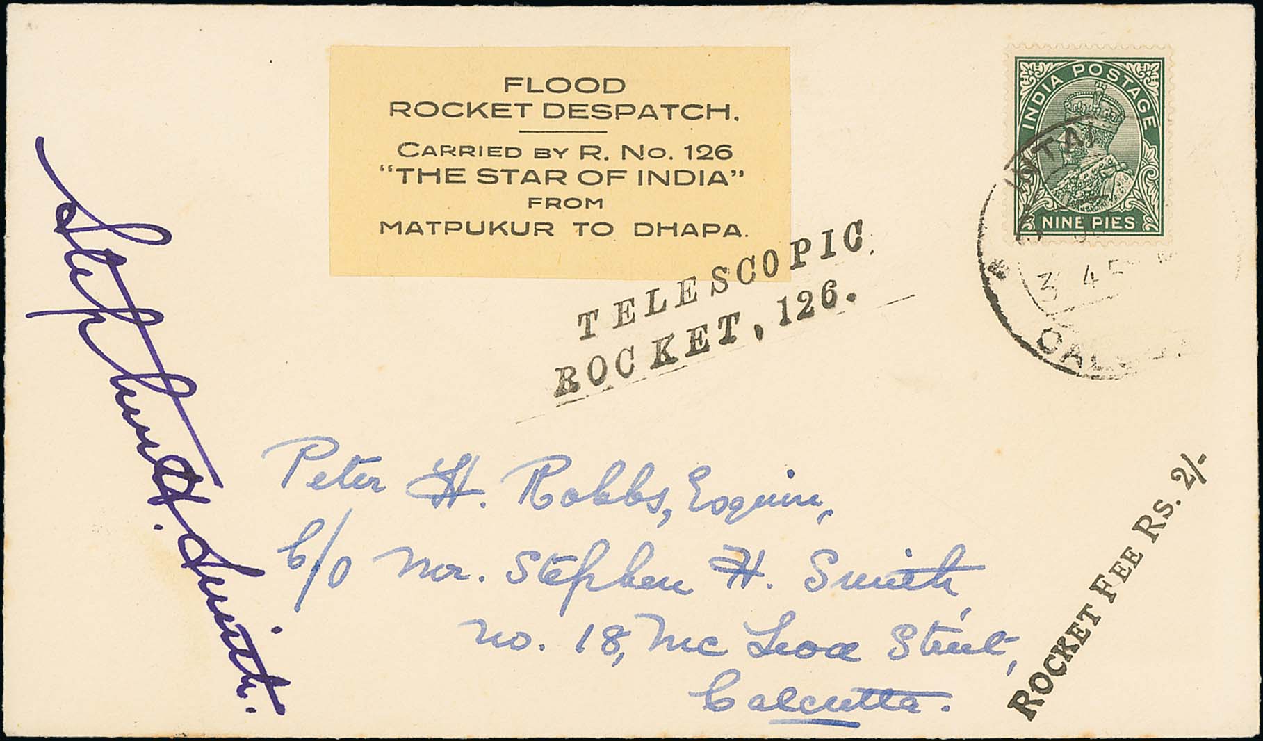 1500 1938 (June 26) Test Rocket flights at Alipore, printed Rocketgram card flown on rocket 164 "Marianne Kronstein" with flight vignette tied by the cachet "STEPHEN SMITH / ROCKETGRAM / ROCKET" and KGV 9p cancelled at Park Street Calcutta, with an unused flight vignette; also a stampless form with violet cachet "THIS MISSIVE WAS /CARRIED BY TEST / ROCKET No. 166 / "DICK TURPIN" / AT ALIPORE", the Stephen Smith cachet in red and Park Street c.d.s, signed by Stephen Smith. Both fine. 102 cards carried on "Marianne Kronstein", 166 on "Dick Turpin". (3).