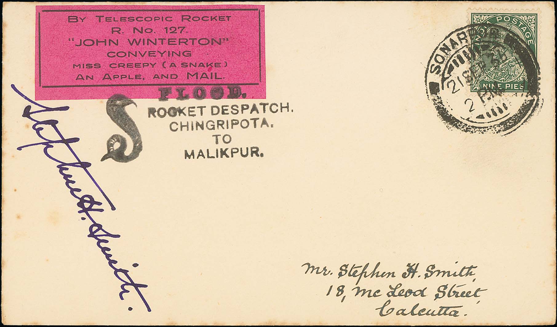 1486 image1936 (Sep 22) "John Winterton" Flood Rocket Despatch from Chingripota to Malikpur carrying a live snake "Miss Creepy", flown cover with violet vignette tied by cachet depicting a snake, a KGV 9p cancelled at Sonarpur. Also a complete sheet of two tete-beche vignettes signed by Stephen Smith. Fine, the sheet very rare, 106 covers flown. (2). Photo on Page 182. (Image1)