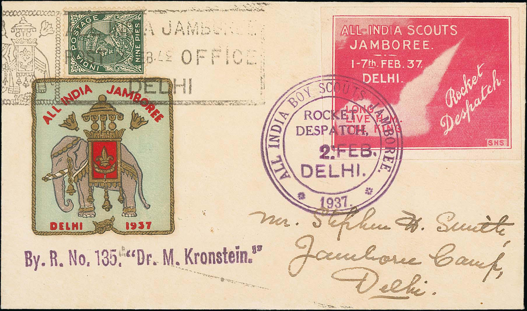 1491 image1937 (Feb 2) All India Boy Scouts Jamboree rocket mail, illustrated cover flown on rocket 135 "Dr M. Kronstein" with red vignette tied by circular "ALL INDIA BOY SCOUTS JAMBOREE / ROCKET / DESPATCH / 2 FEB. / DELHI / 1937", a KGV 9p tied by the special pictorial "ALL INDIA JAMBOREE / POST OFFICE / DELHI" datestamp (year date inverted), 176 covers flown, scarce so fine. Photo on Page 182. (Image1)