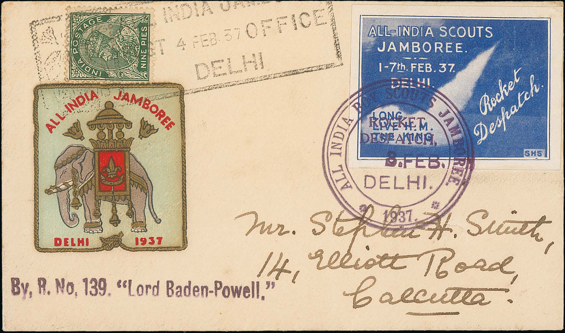 1488 1937 (Feb 1) All India Scouts Jamboree, printed Greetings from the Chief Scout of Bengal, message of loyalty from King George VI and Queen Elizabeth, and an illustrated lettersheet from the Cubs and Scouts provincial headquarters advertising clothing and equipment for sale, all with circular cachet "ALL INDIA BOY SCOUTS JAMBOREE / ROCKET / DESPATCH / 1 FEB. / DELHI / 1937", flown in the first propaganda rocket, the last two signed by Stephen Smith. 200 Bengal Greetings messages and 400 of the illustrated Cubs and Scouts lettersheet flown, very scarce so fine. (3).