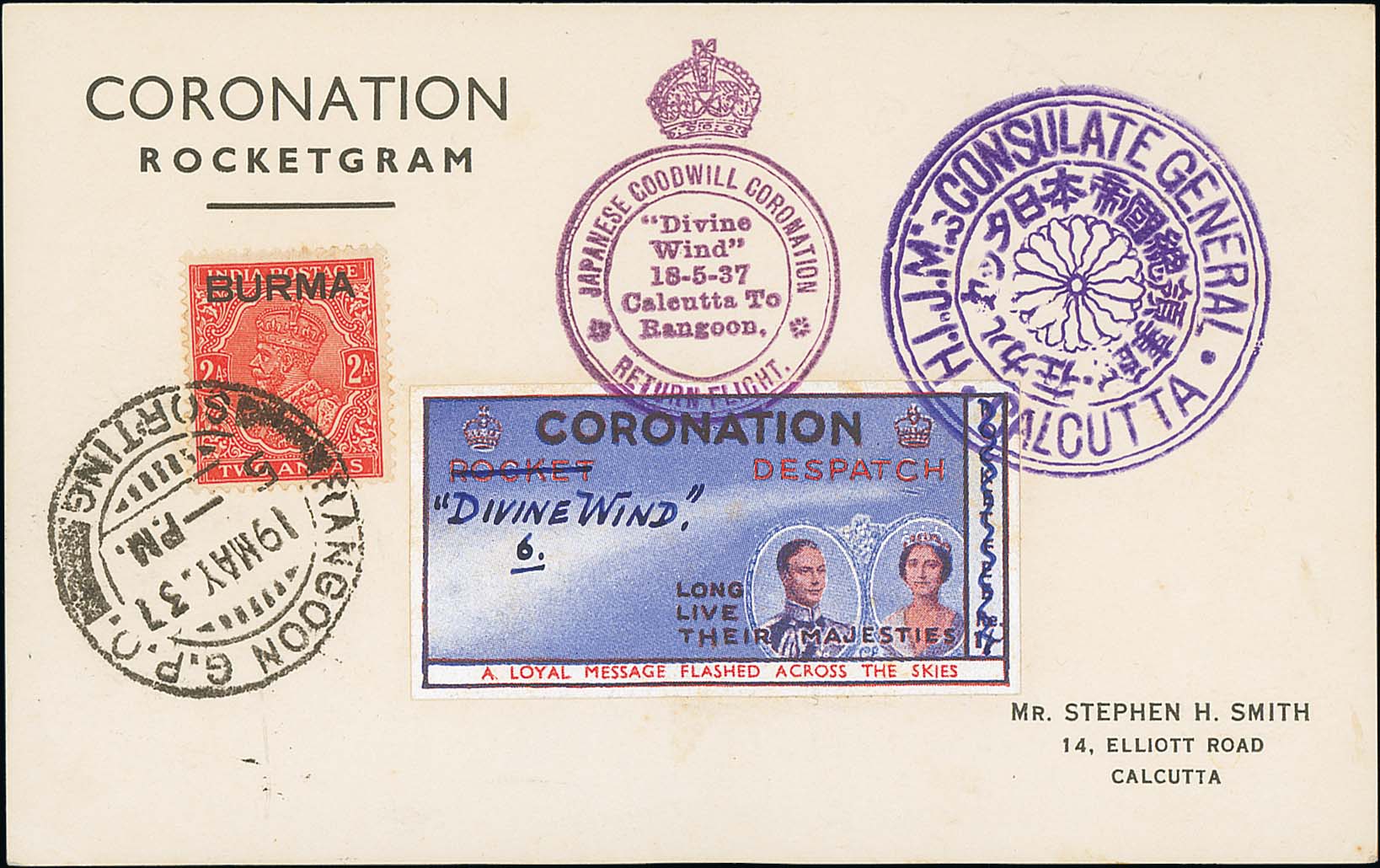 1495 image1937 (May 19) Burma "Divine Wind" Japanese Goodwill Coronation Rocketgram card bearing Coronation rocket vignette altered to read "Divine Wind" in manuscript and numbered "6", tied by violet cachets "JAPANESE GOODWILL CORONATION / "Divine Wind" / 18-5-37 / Calcutta to / Rangoon / RETURN FLIGHT" and "H.J.M s CONSULATE GENERAL / CALCUTTA", a Burma KGV 2a stamp tied by Rangoon c.d.s, signed on the reverse by Stephen Smith, fine and very scarce. Photo on Page 182. (Image1)