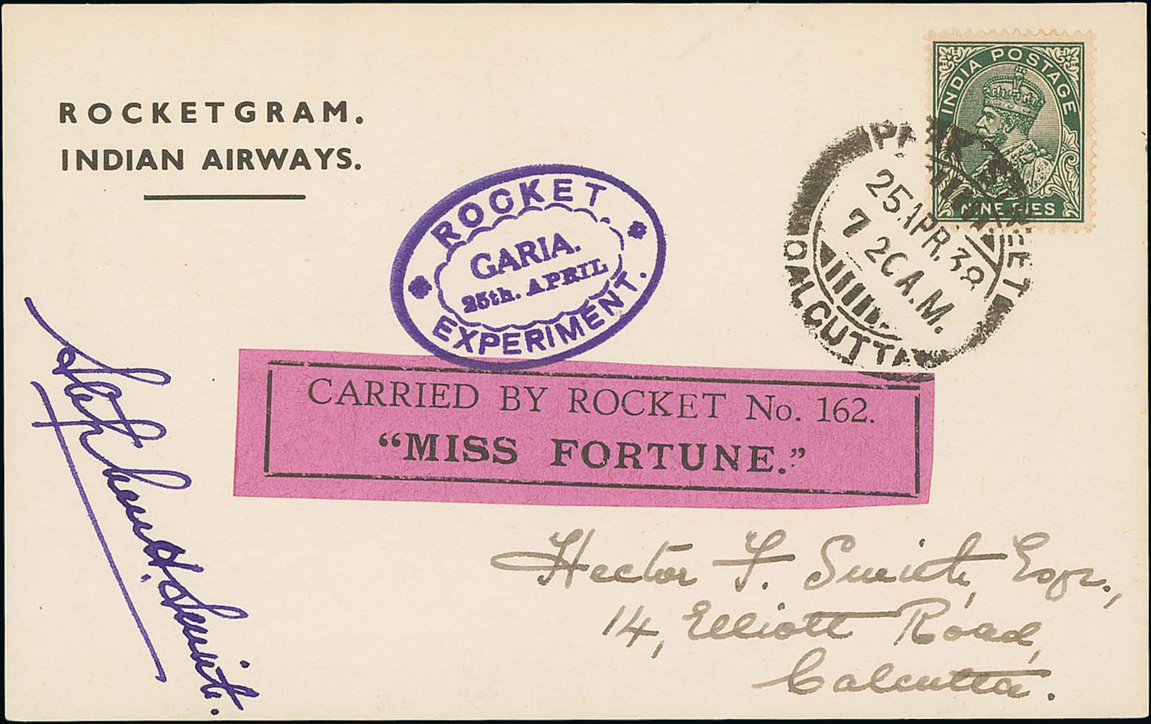 1498 image1938 (April 25) "Miss Fortune" all metal rocket flight 162 at Garia, Rocketgram card with flight vignette tied by violet oval "ROCKET / GARIA / 25th APRIL / EXPERIMENT", a KGV 9p cancelled at Park Street Calcutta, also an unused flight vignette. A fine and scarce card, only 56 flown. (2). Photo on Page 182. (Image1)