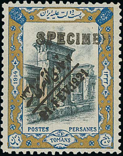 1532 image1921 3c - 5t Set of eleven with bilingual "21. FEV. 1921" overprint applied after the Coup d Etat of Riza Khan, all overprinted "SPECIMEN" for distribution by the U.P.U, superb unmounted mint and very scarce. With Ceremuga Certificate (2005). (11). Photo on Page 152. (Image1)