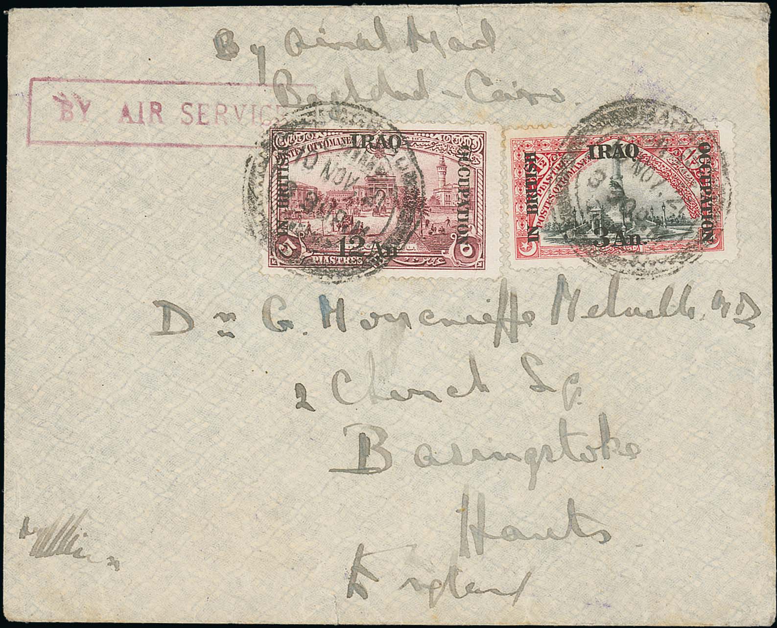 1536 image1921 (Nov 10) Cover from Baghdad to England endorsed "By Air Mail Baghdad-Cairo" and handstamped boxed "BY AIR SERVICE", franked 3a postage + 12a air fee. Carried on the first R.A.F Baghdad to Cairo flight on November 12th, the only flight for which the air fee was 12a (increased to 1r for the second flight). Scarce, 1663 covers flown but few have survived. Photo on Page 190. (Image1)