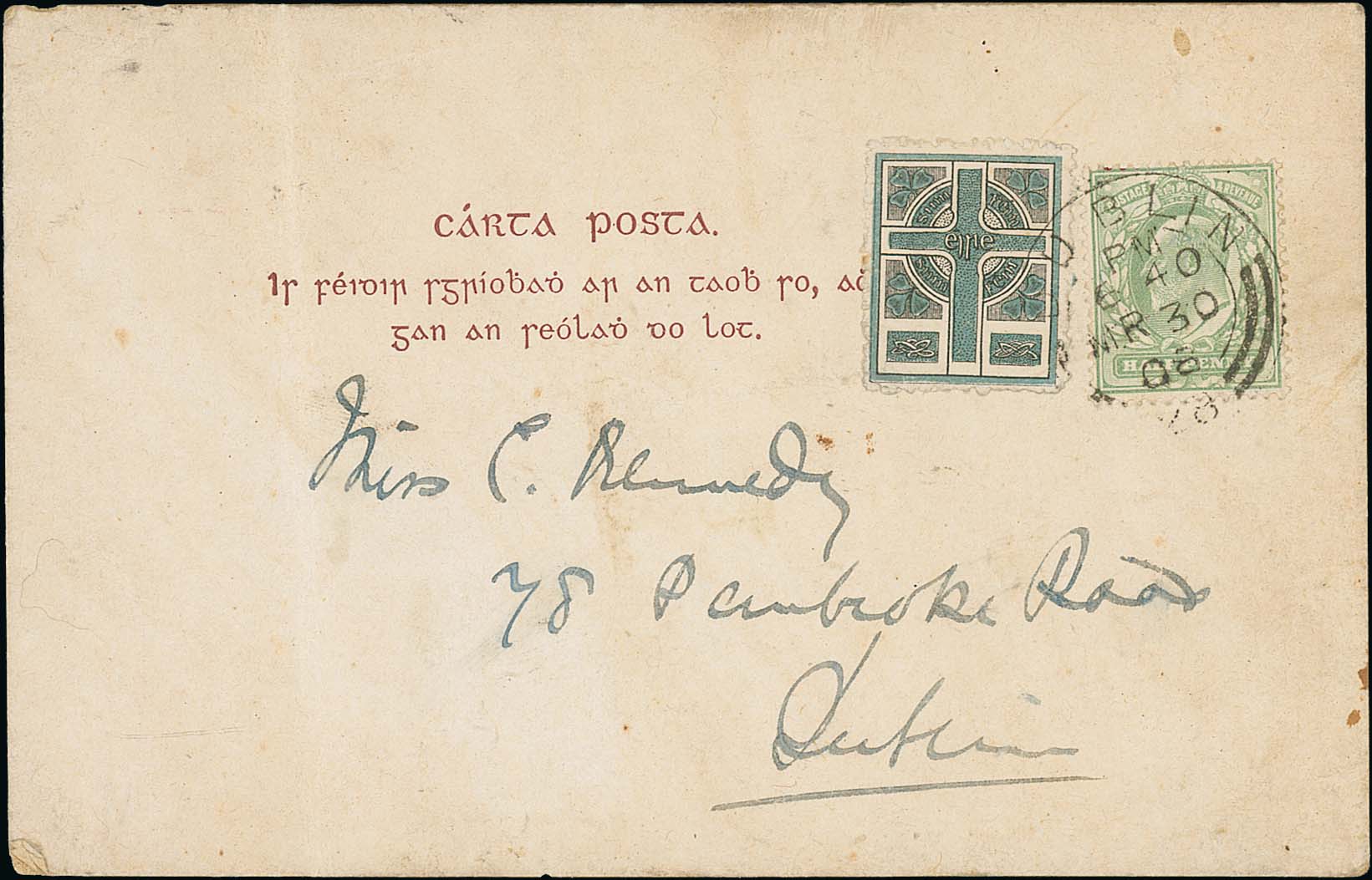 1538 image1908 (Mar 30) Postcard with the heading printed in Irish, posted within Dublin franked KEVII ½d and Celtic Cross Sinn Fein propaganda label, perf 11 in bluish green and black, both tied by Dublin c.d.s, commercial message on reverse. Vertical fold at left of card, otherwise fine, a scarce use contrary to regulations but still cancelled by the datestamp. Photo on Page 190. (Image1)