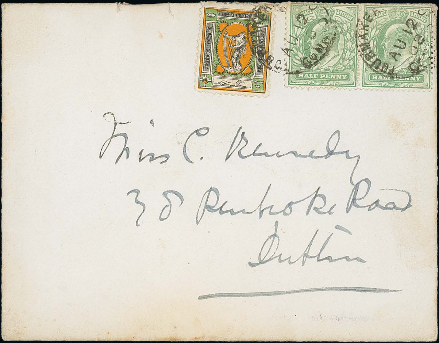 1539 image1908 (Aug 12) Cover to Dublin with KEVII ½d pair and harp & female figure Sinn Fein propaganda label, perf 11 in pale green, yellow and black, all tied by datestamps of Tourmakeady, Co. Mayo. A fine and scarce use, contrary to regulations but still cancelled by the Tourmakeady c.d.s. Photo on Page 190. (Image1)