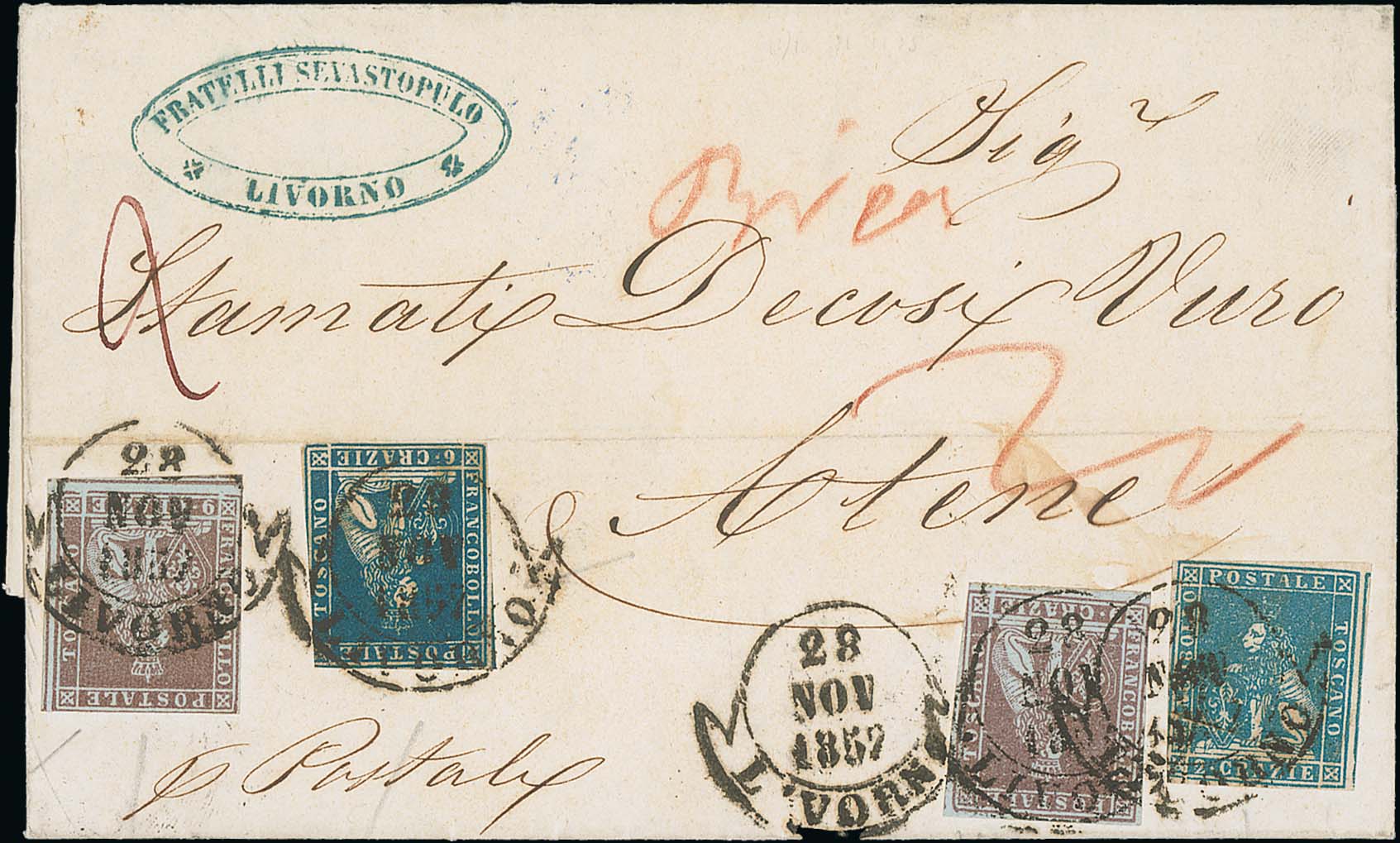 1543 imageTuscany. 1857 (Nov 28) Entire letter from Livorno to Athens, 26c postage paid by 2c + 6c + two 9c stamps, Piraeus and Athens backstamps, fine and attractive. Photo on Page 190. (Image1)