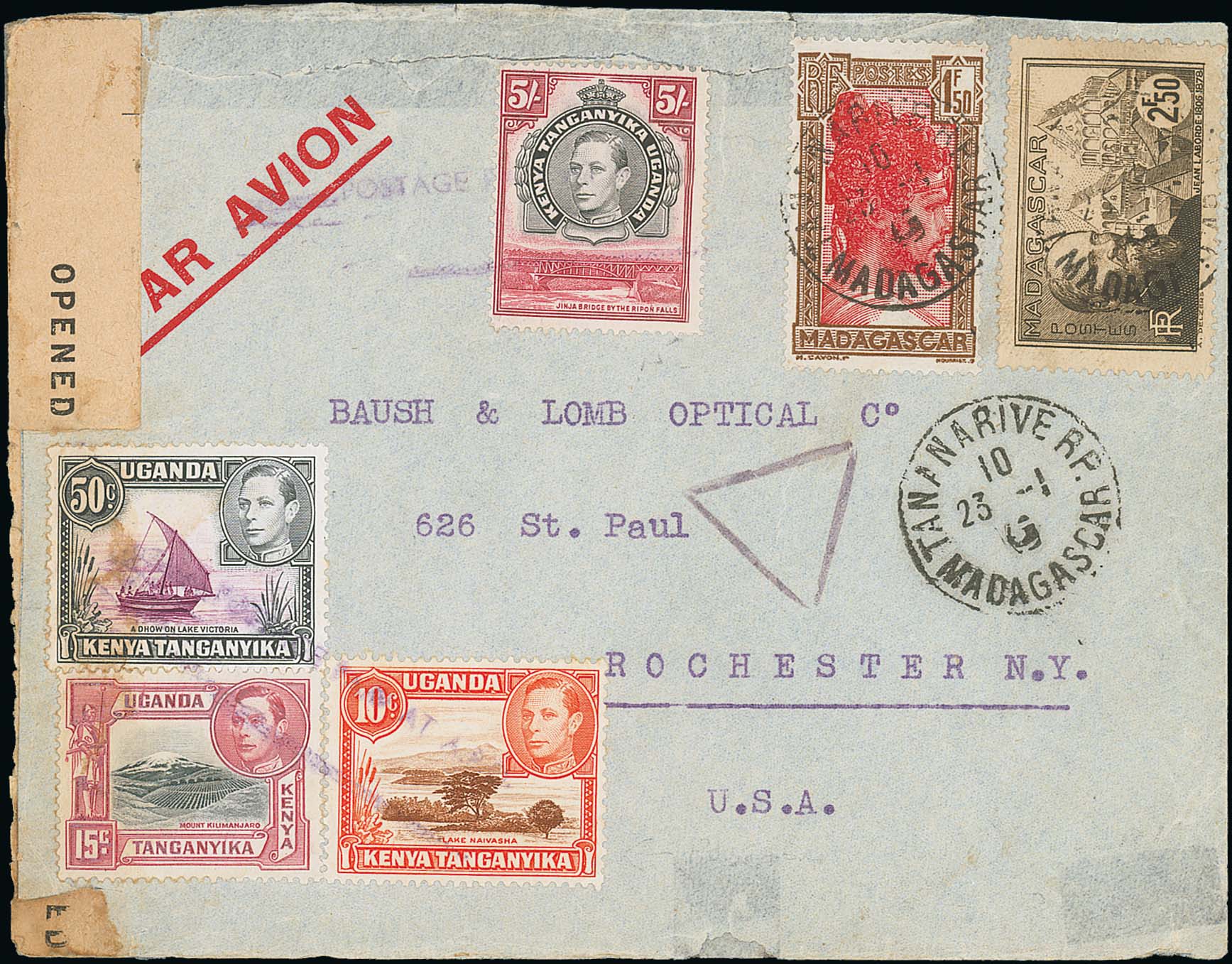 1579 imageMadagascar. 1943 (Jan 23) Air Mail cover to U.S.A with Madagascar 1f50 + 2f50 cancelled at Tananarive and Kenya 10c + 15c + 50c + 5sh all cancelled violet "POSTAGE PAID AT A.P.O", British Censorship label and cachet, backstamped at E.A. A.P.O 84 (Feb 3, Nairobi). A scarce and intriguing combination franking, the KUT stamps overlapped by the censor seal applied in Madagascar (now partly removed to display the stamps) proving they were applied locally, the cancel being the "Postage Paid at A.P.O in O.E.T.A" handstamp used at E.A A.P.O 74 and 75 in 1941 now reused with the final line cut away. Rossiter illustrates two other January 1943 air mail covers with local stamps for postage to Kenya and G.B stamps applied for the onward air fee to U.S.A all similarly cancelled. The air fee was reduced to 4/70 on January 1st but this was probably not known in Madagascar at this date, with the old fee of 5/75 still applied. Upper and lower edge tears, repaired internally with tape, otherwise fine and scarce, the subject of an article in Spring 2024 E.A.S.C Bulletin. Photo on Page 202. (Image1)