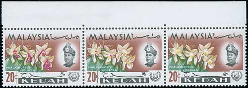 1597 imageKedah. 1965 20c, Strip of three with upper margin, variety bright purple omitted, superb unmounted. S.G. 121a, £1,650. Photo on Page 152. (Image1)