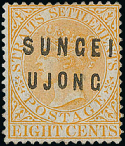 1598 imageNegri Sembilan - Sungei Ujong. 1882 8c Orange with Sungei Ujong overprint types 11 + 14, fine unused, small part gum, very scarce. With R.P.S Certificate (1940). S.G. 25. £3,750. Photo on Page 198. (Image1)