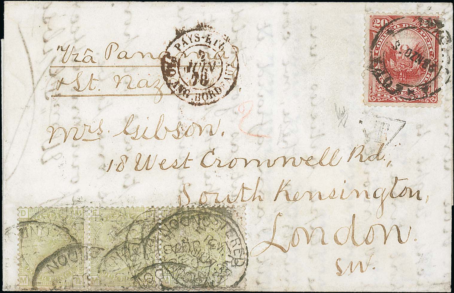 1711 image1878 (Mar 28) Entire letter from Lima to London "via Panama & St. Nazaire" with Peru 20c tied by Lima c.d.s and G.B 1877 4d sage-green plate 15 strip of three applied in Peru but cancelled upon arrival in London by oval Registered datestamps (June 3), triangular "T" handstamp, Lima backstamp (Apr 3) and five French transit datestamps. An intriguing combination cover, with 1989 Peter Holcombe Certificate stating "Genuine, "T" handstamp due to a stamp becoming detached" (to left of remaining stamp, prior to cancelling - which may be correct) and "with G.B stamps applied upon arrival to collect the postage due" (which is clearly incorrect). Photo on Page 212. (Image1)