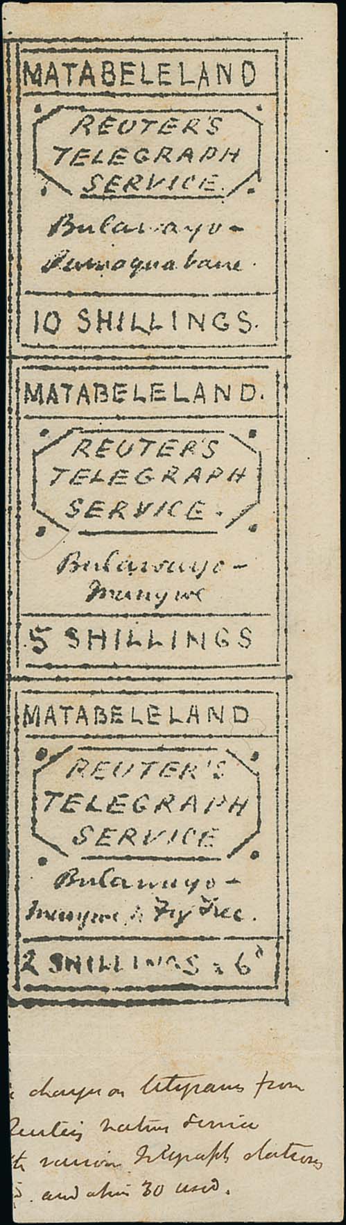1718 image1894 Reuters Telegraph Service, mint vertical se-tenant strip of 2/6, 5/- and 10/- stamps from the right of the sheet, lower margin with partial inscription in the hand of Capt. C.L Norris-Newman "charges on telegrams from Reuters native service with various telegraph stations ..... and about 30 used", part gum, upper margin reduced, fine and scarce. Also a crude forgery (or copy of an essay) strip of three, and an 1892 (Nov 25) letter written and signed by Norris-Newman (editor "Northern Post & Border News" & Reuters Special Agent) from Aliwal North, Cape Colony, to G.B Duerst, Hon. Treasurer, Philatelical Society, Manchester, seeking to buy Carlist stamps, also offering to swap stamps of Southern Africa. The strip ex H.C Dann, illustrated in an accompanying article from Philatelic Magazine (6 Sep. 1935). S.G. T1a, £3,500. (3). Photo on Page 210. (Image1)