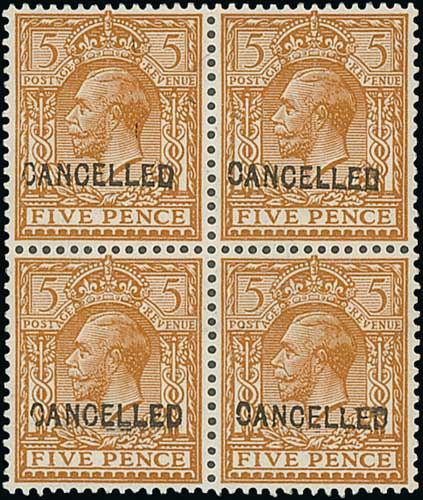 1913 5d Brown, watermark Royal Cypher, block of four each overprinted "CANCELLED" type 24, superb unmounted. S.G. £3,200 for mounted singles. Photo on Page 32. (Image1)