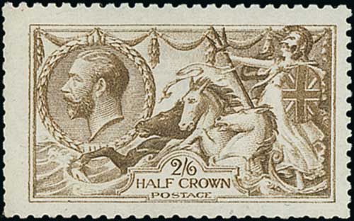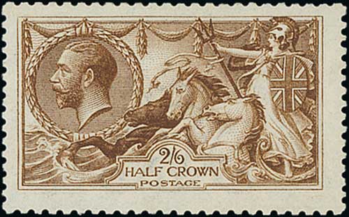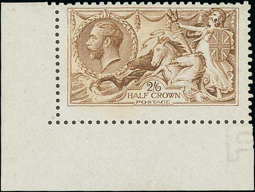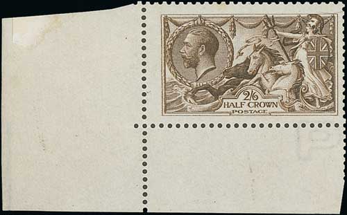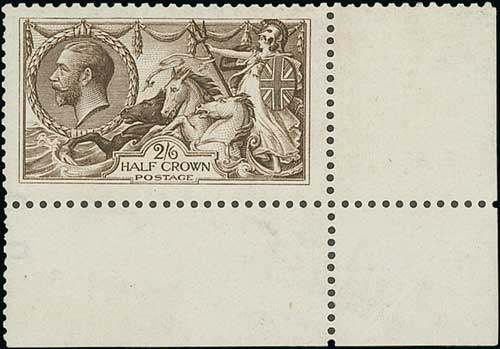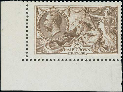 1913 Waterlow 2/6 deep sepia-brown, lower right corner marginal single, fine unmounted mint. S.G. 399, £750+. Photo on Page 18.
