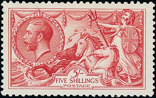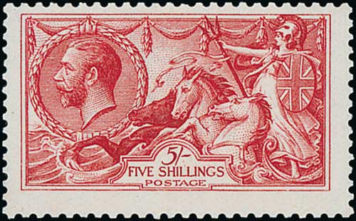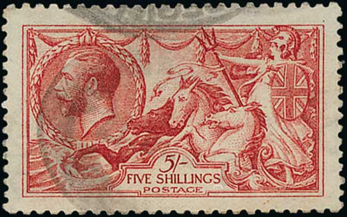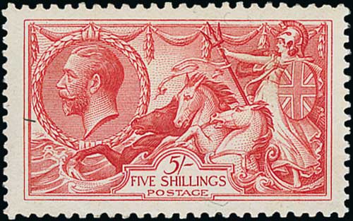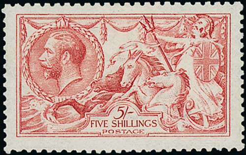 1913 Waterlow 5/- rose-carmine, centred a little high, fine unmounted mint. S.G. 401, £1,100. Photo on Page 24.