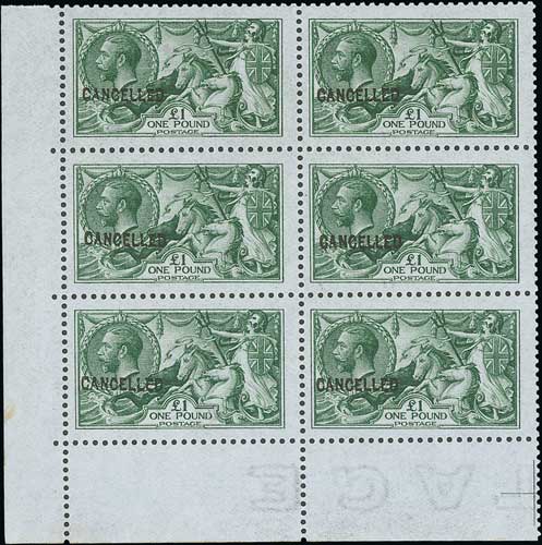 1913 Waterlow £1 yellowish green (deep shade) colour trial on Joynson paper, lower left corner marginal block of six, lower inscriptional watermark inverted, each overprinted "CANCELLED" type 24, unmounted mint original