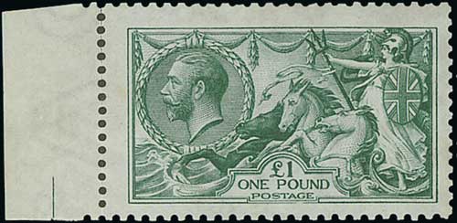 1913 £1 Green, margin at left, a few split perfs between stamp and margin, reverse with traces of a very light hinge mark, otherwise superb. Photo on Page 24. (Image1)