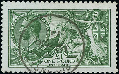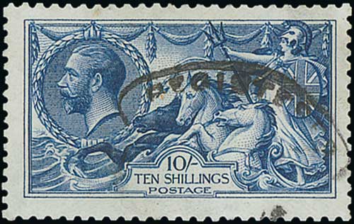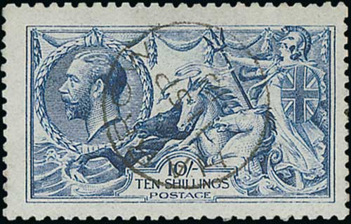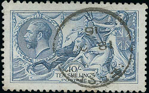 1915 De la Rue 10/- pale blue fine used with Jersey single ring datestamp. S.G. 413, £900. Photo on Page 24. (Image1)