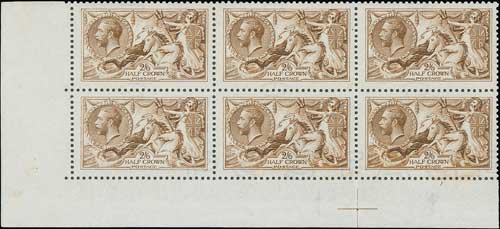 1915 De la Rue 2/6 yellow-brown, lower left corner block of six (3x2), mint original gum, the lower row of three watermarked "POSTAGE" due to a large upwards displacement of the watermark, lightly mounted on the upper left