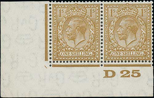 1924 1/- Bistre-brown, watermark Block Cypher, lower left corner "D25" Control pair with imperf margins, variety watermark inverted, superb unmounted mint. Very scarce. S.G. 429wi (£1,200 as single stamps). Photo on