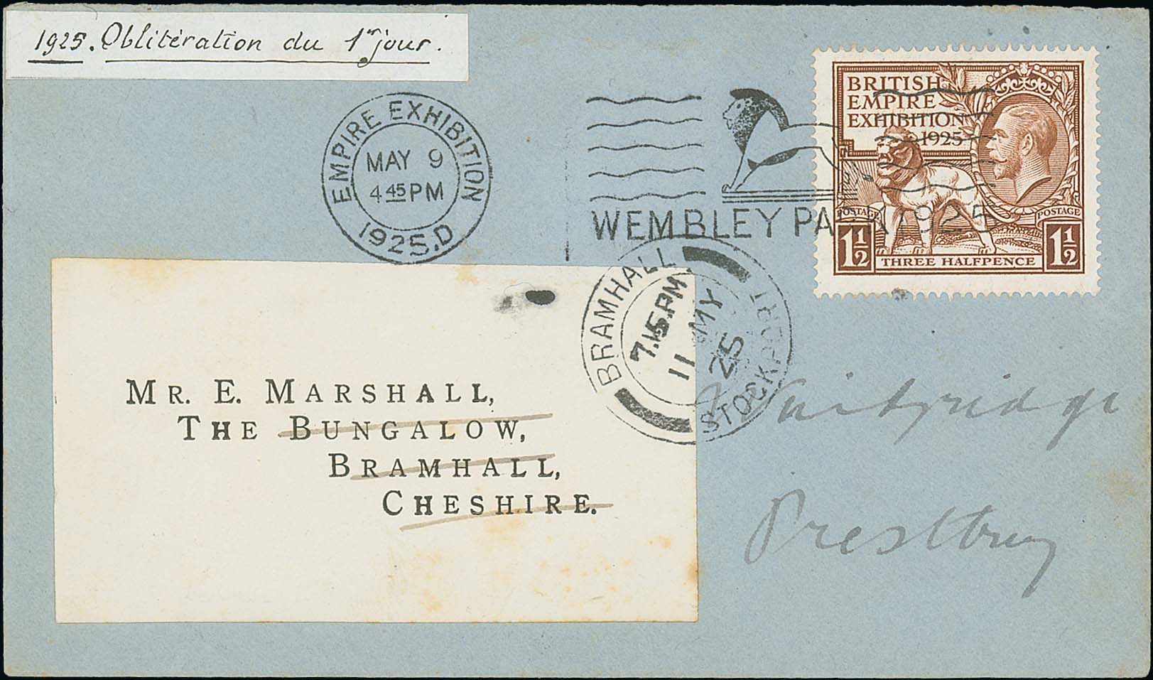 1925 (May 9) British Empire Exhibition 1½d used on First Day Cover tied by the Empire Exhibition machine, redirected from Bramhall to Prestbury, fine. Photo on Page 14. (Image1)
