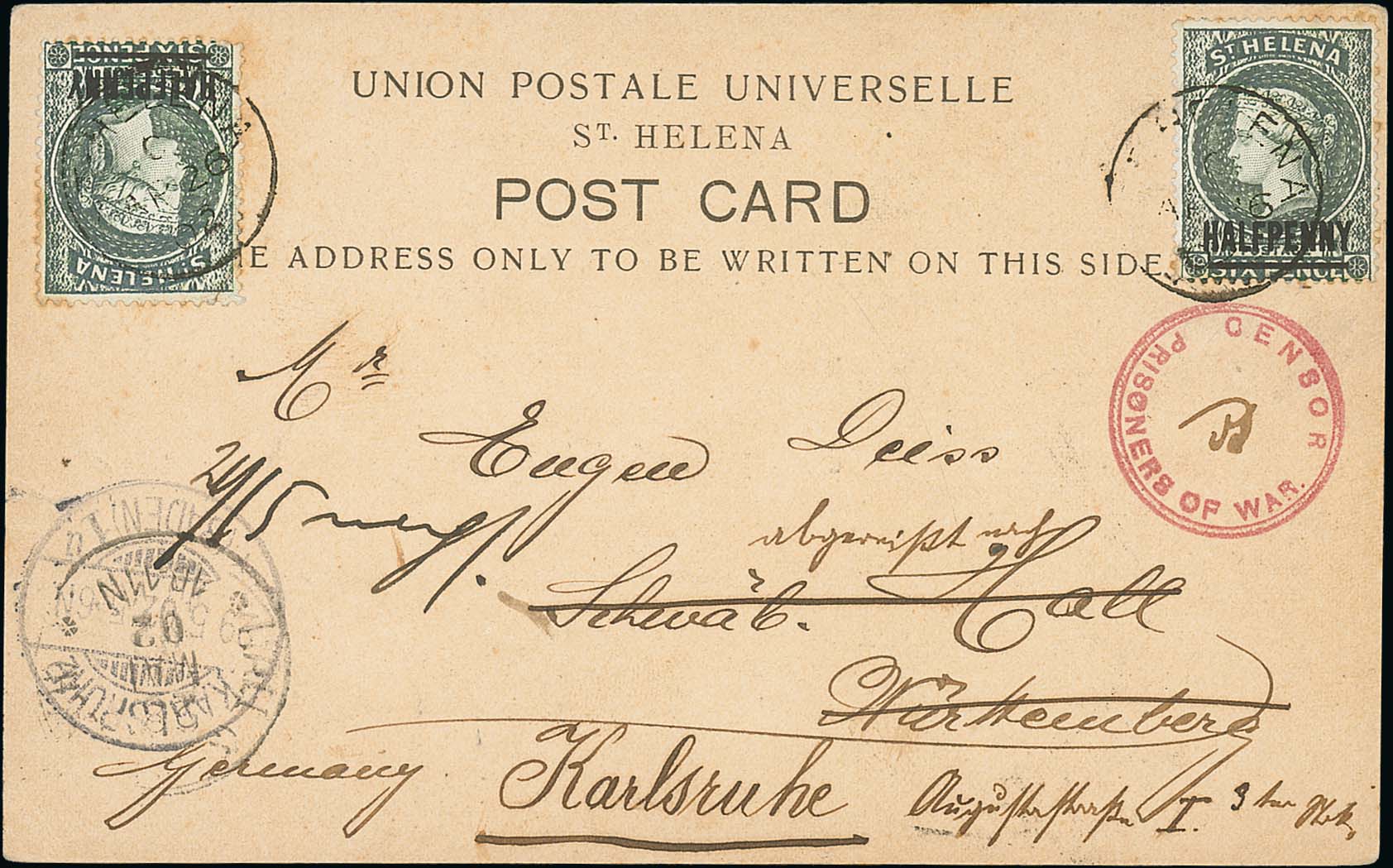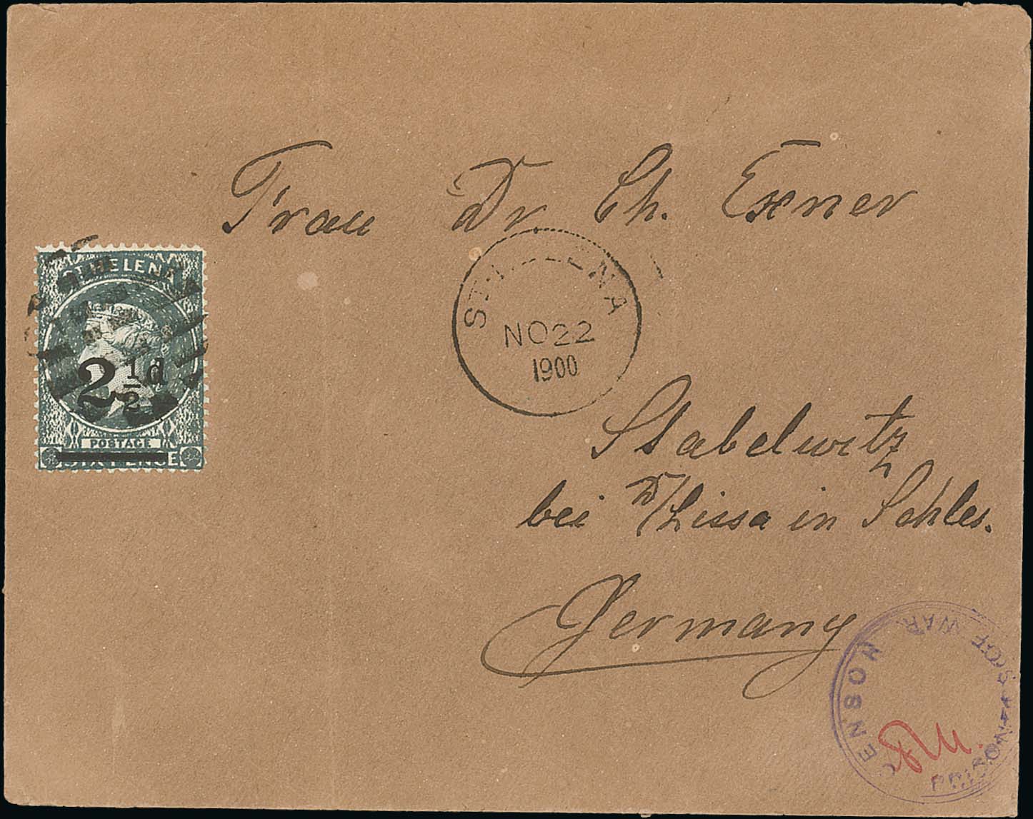violet "PRISONERS OF WAR / CENSOR / BROAD BOTTOM CAMP" with handstruck initials "a.w.p" of Lt. Arthur Phelps, black circular "R" and oval "REGISTERED / ST. HELENA", datestamps of St. Helena, London and Altona. Clearly a philatelic franking, still