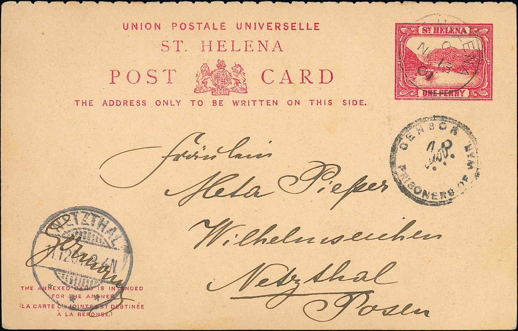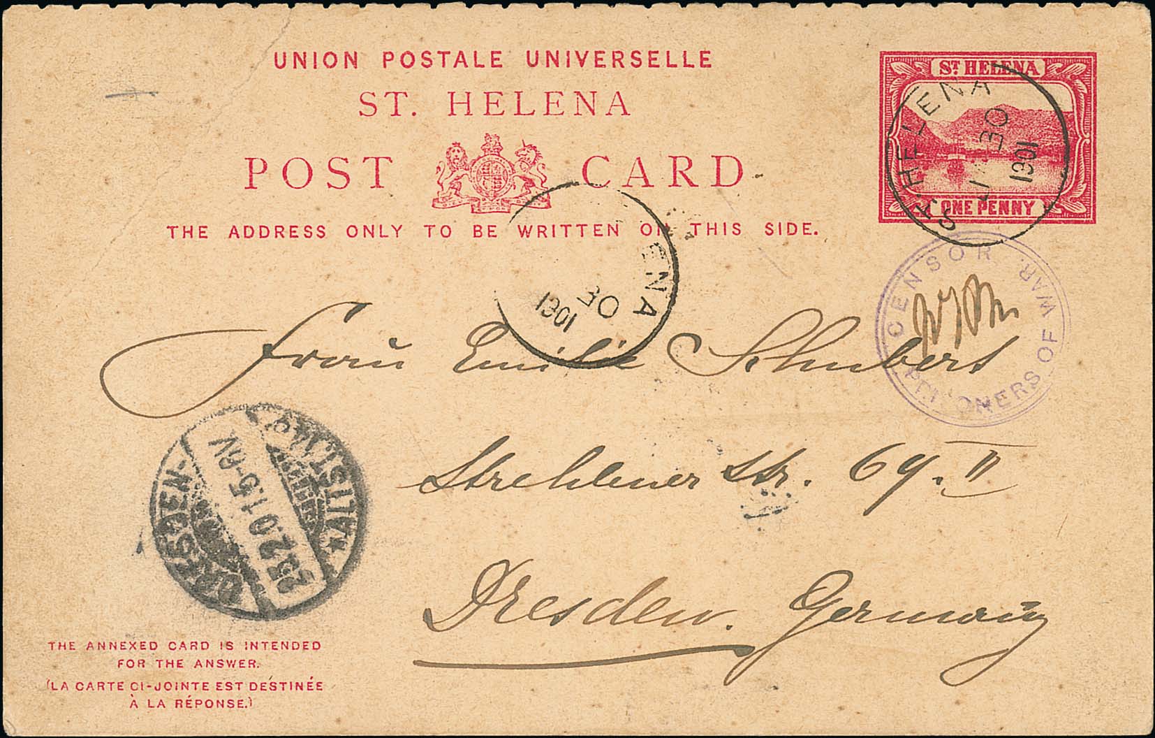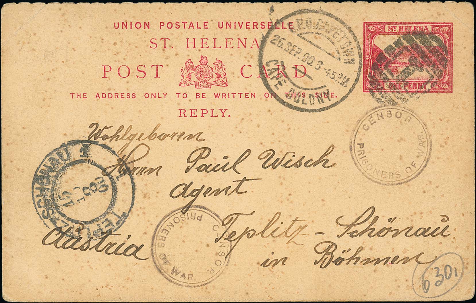 1900 (Sep 11) 1d Reply card (reply half) written by a P.O.W in St. Helena but apparently posted from Cape Town to Austria, cancelled by numeral "1" with a Cape Town c.d.s (Sep. 26) alongside, two circular censor cachets