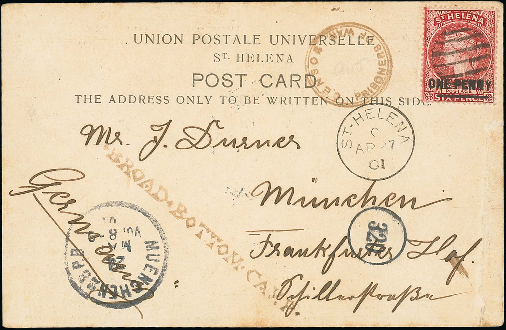 1901 (Sep 25) 1d Reply card written by P.O.W Ad. Merkel, to Germany cancelled by St. Helena c.d.s with light Broad Bottom Camp Censor initials "a.w.p"; also 1901 censored cover from Wellington, Cape Colony, to "W.F Smith, Prisoner of War, c/o