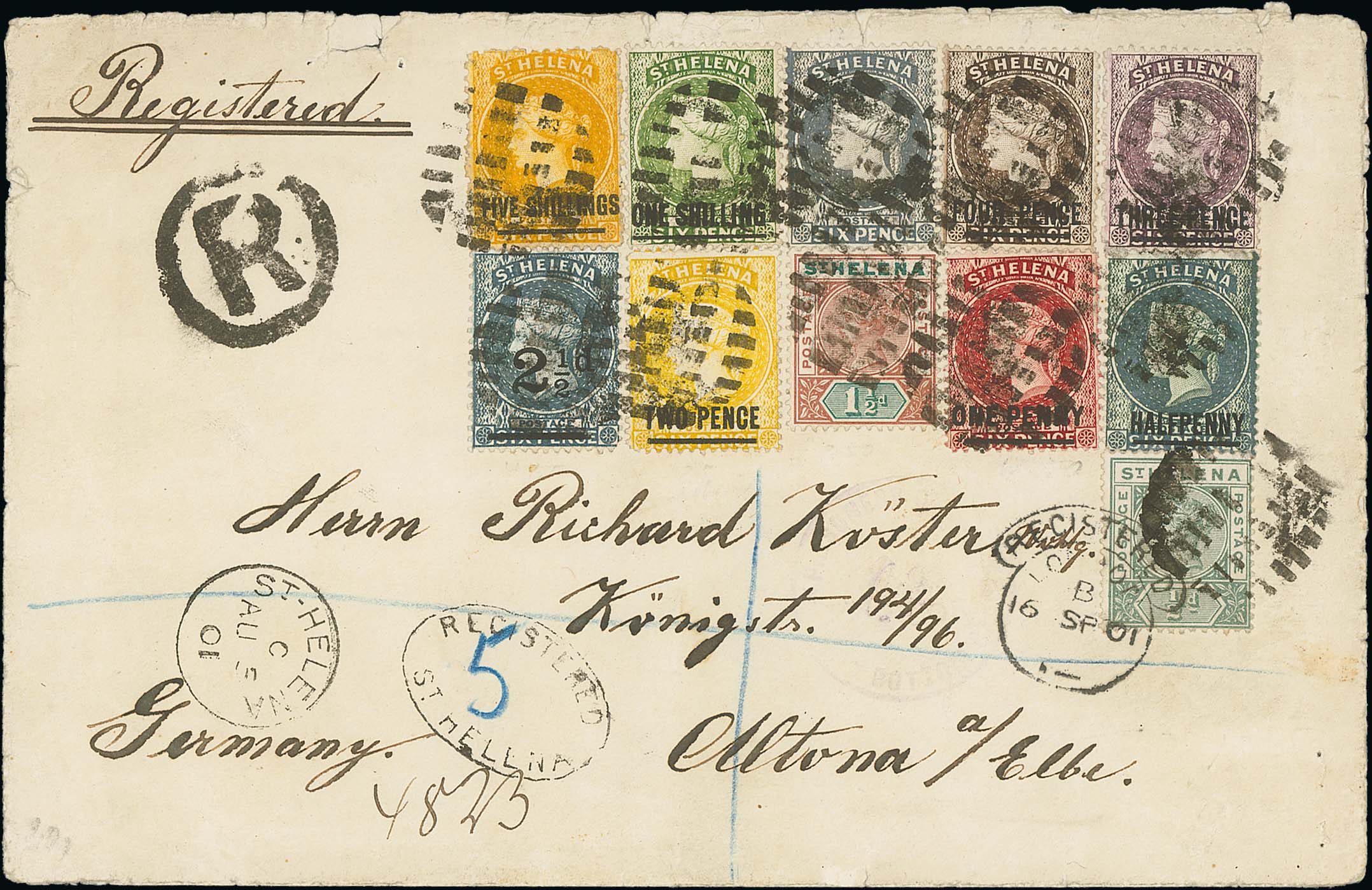 1901 (Aug 5) Registered cover to Germany bearing eleven different ½d - 5/- stamps (all values, both 1893 and 1897 ½d), probably all the stamps then available at the Post Office, tied by cork cancels (K98), light
