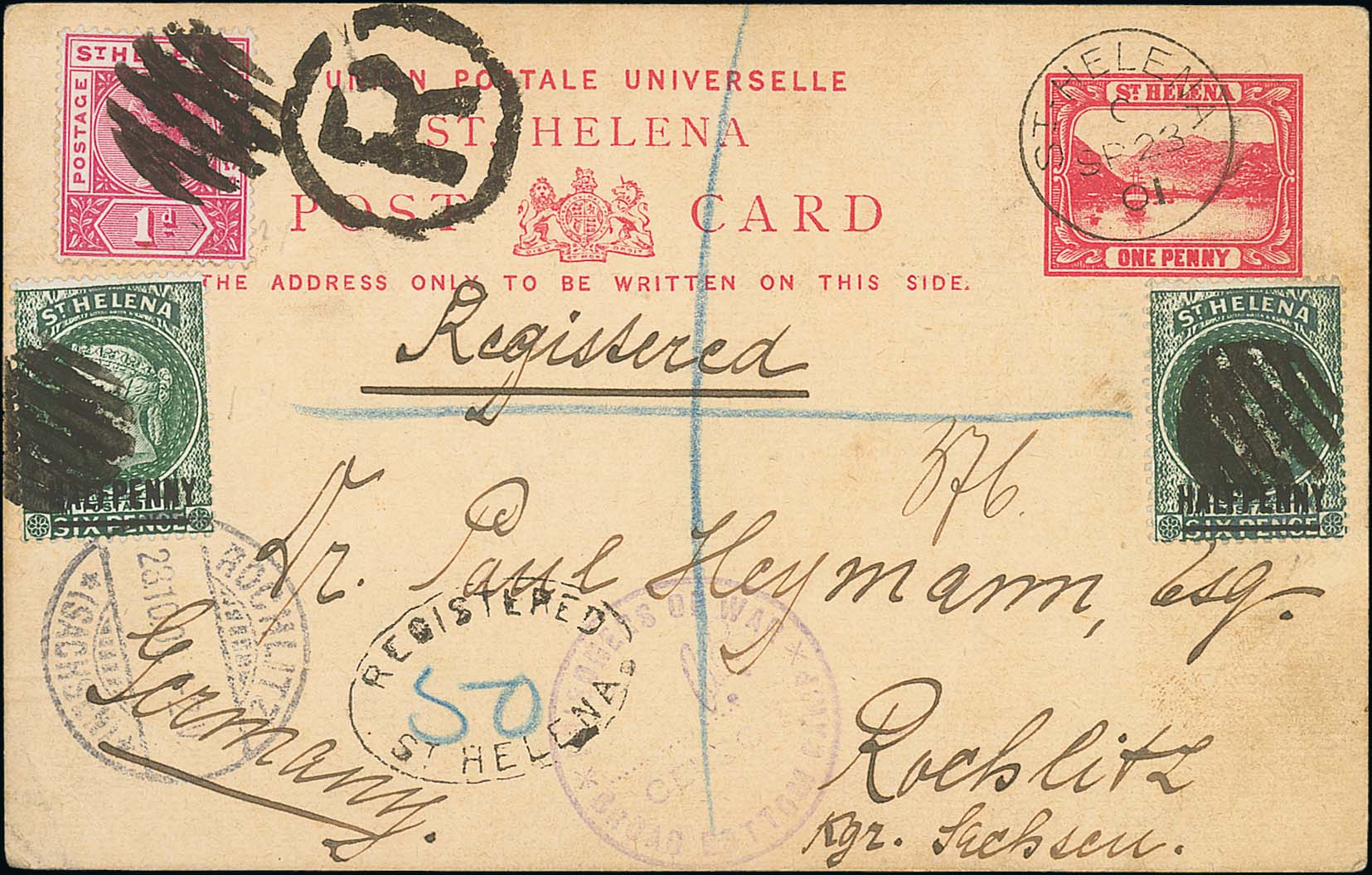 1901 (Sep 23) 1d Postcard from Otto Scheffler, registered to Germany franked 1893 ½d (2) + 1896 1d, the stamps with cork cancels (K101), the postcard stamp tied by St. Helena c.d.s, black circular framed "R" and oval